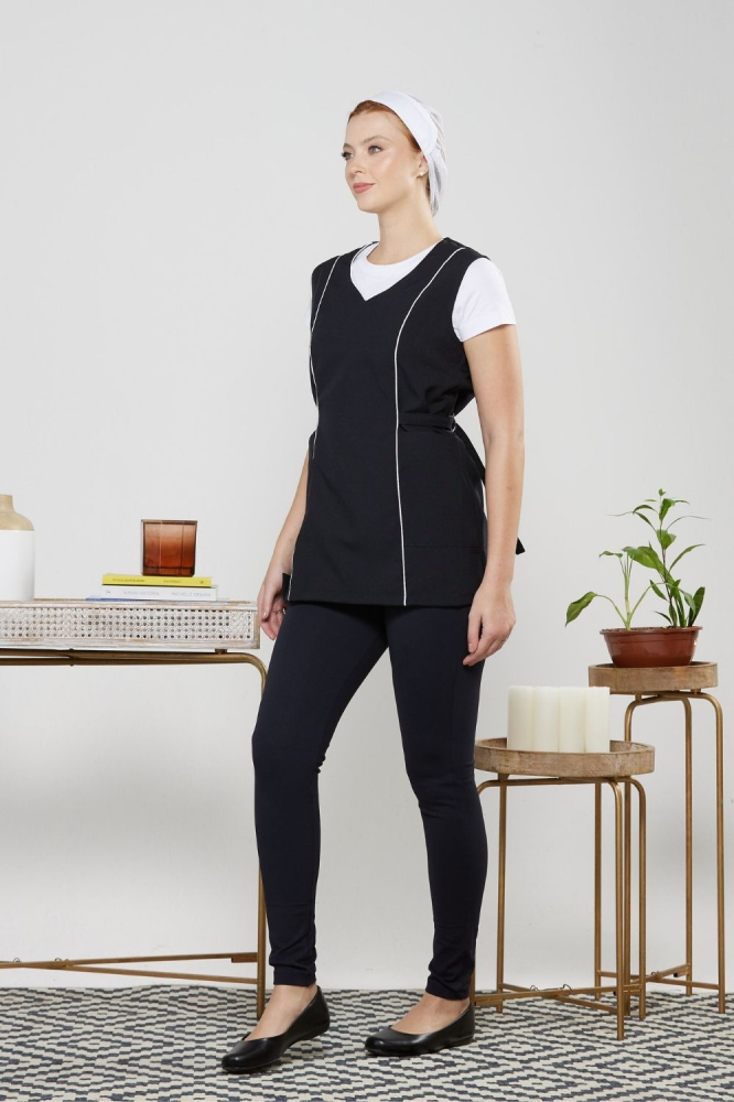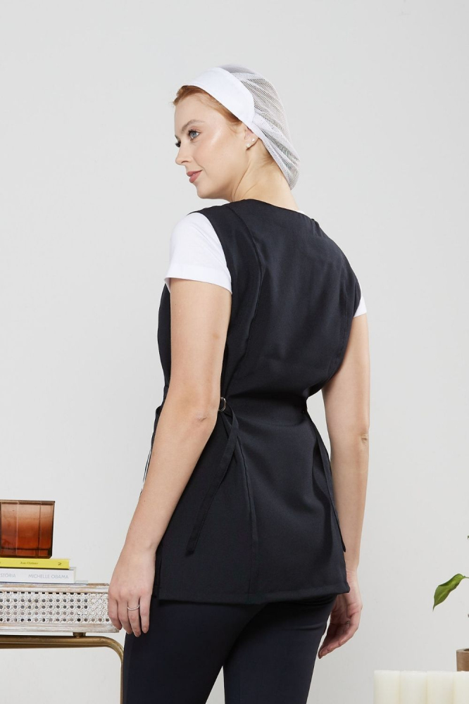 Túnica vip preta com vivo branco frontal e no decote, com fechamento lateral com alça e dois bolsos.